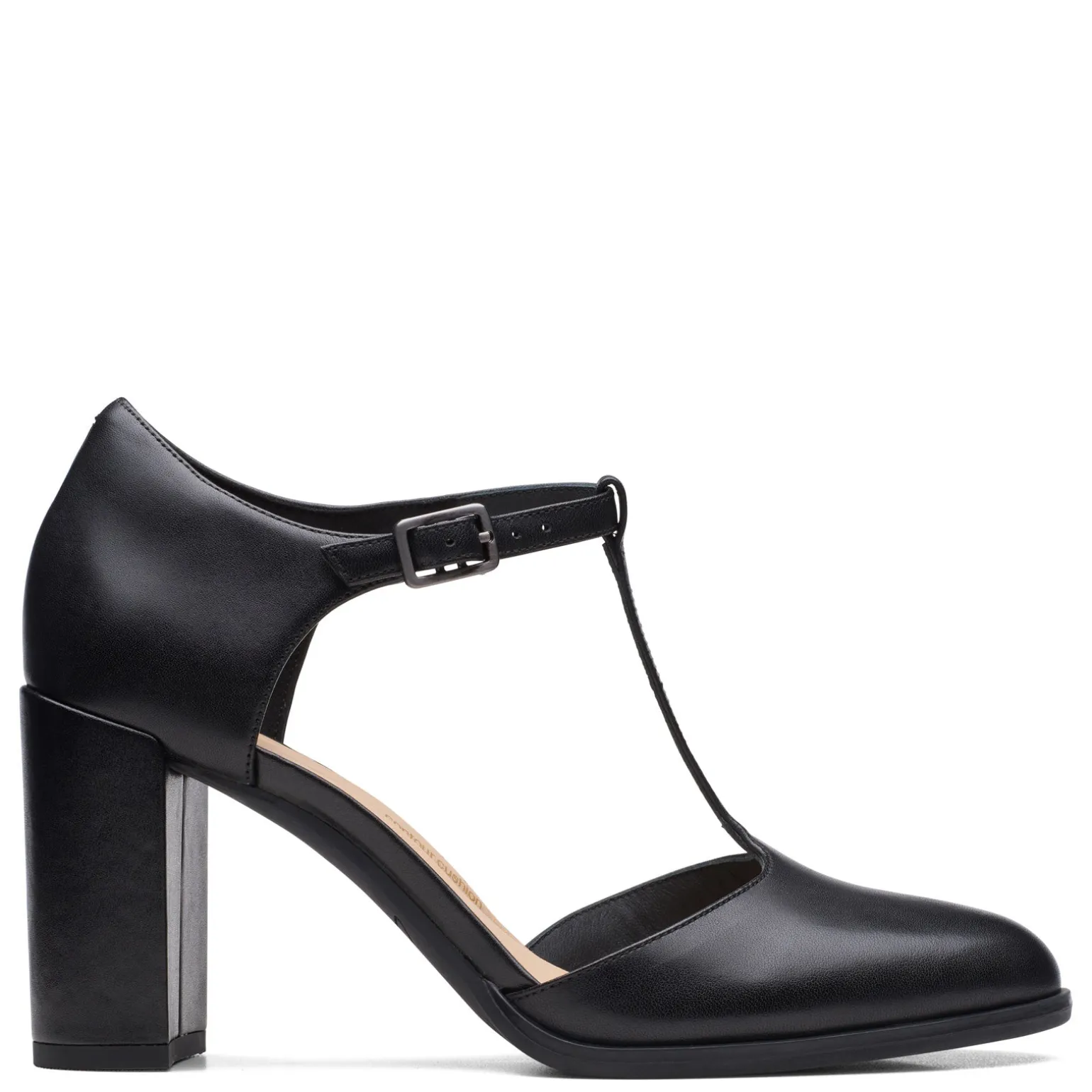 Women’s Clarks, Freva 85 Bar Pump Classically inspired and beautifully crafted, our Freva 85 Bar Mary Jane pump will always be in fashion. Pair it with tailored trousers and a button-down blouse to add a timeless finishing touch to your office ensemble Responsibly sourced premium leather upper Leather lining and sock offer a luxurious feel T-strap design with adjustable ankle strap Contour Cushion footbed with added arch support Rubber outsole3 1/3-inch block heel