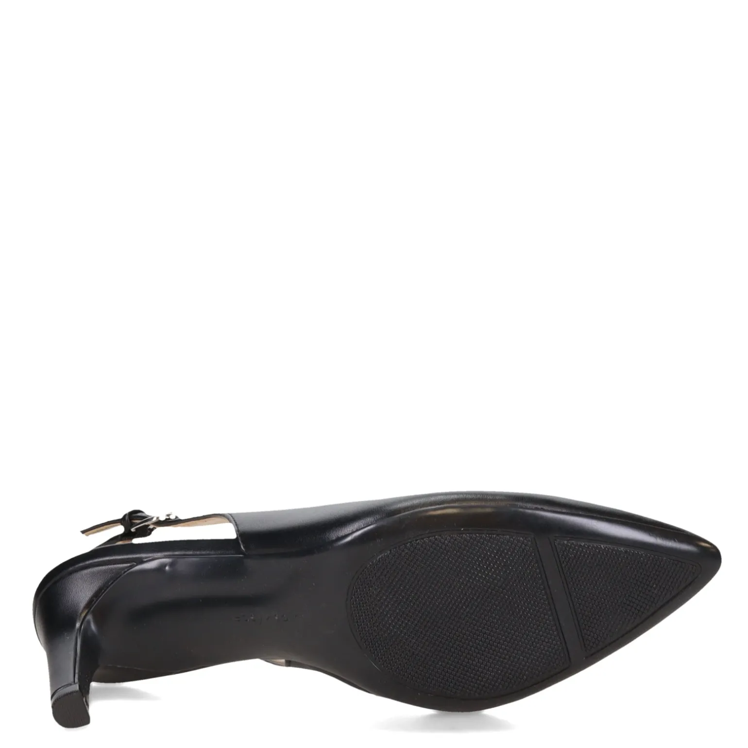 - Faux leather or patent upper in a high heel stiletto slingback pump style
