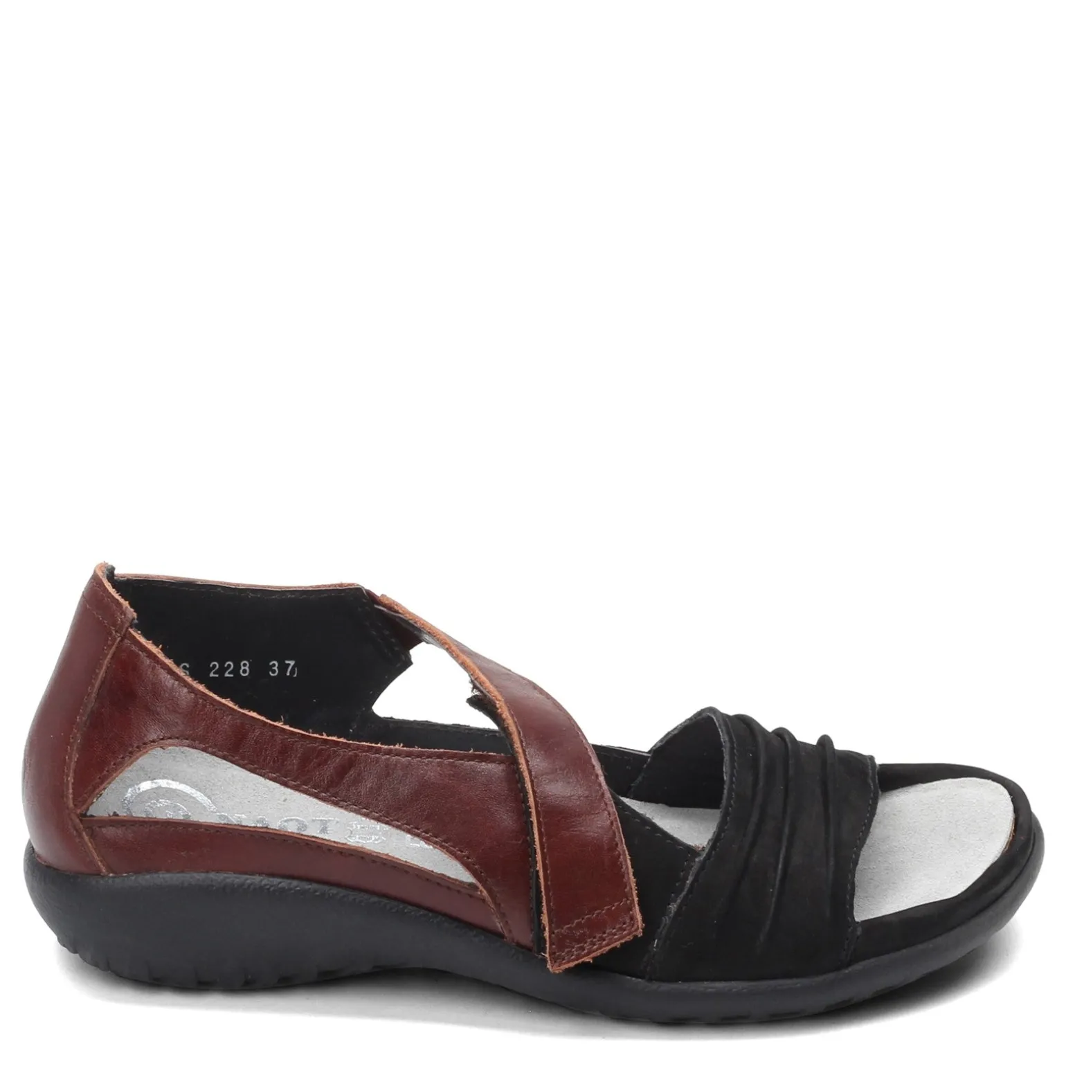 Women’s Naot, Papaki Sandal. Add a touch of style to any outfit with these low heel sandals. This foot flattering design features an asymmetrical strap, pleated accents and a closed back design.