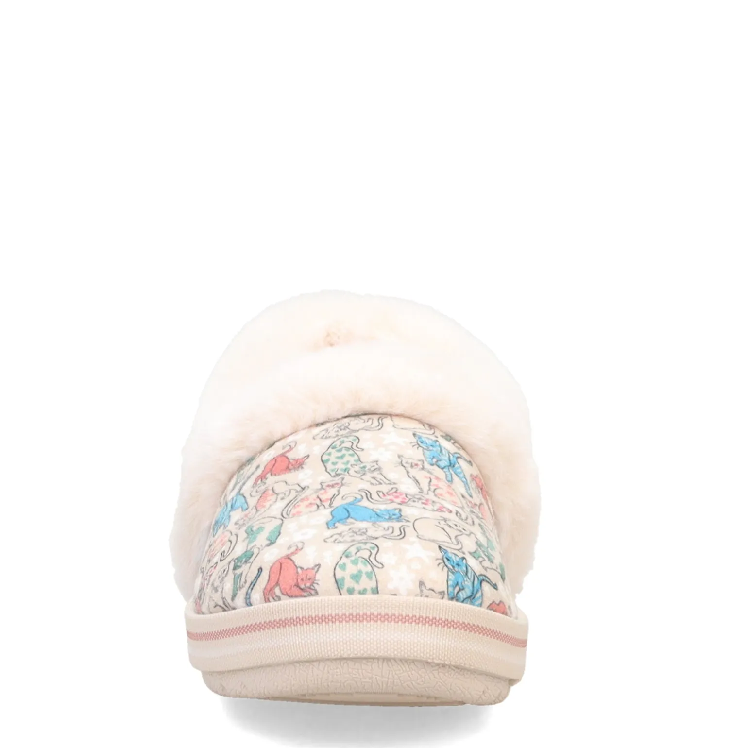 This adorable cat themed slipper will keep you super comfortable and put a smile on your face! It features a fun cat themed �Stress Fur-ee� print design, a cushy memory foam insole and plush faux fur trim.