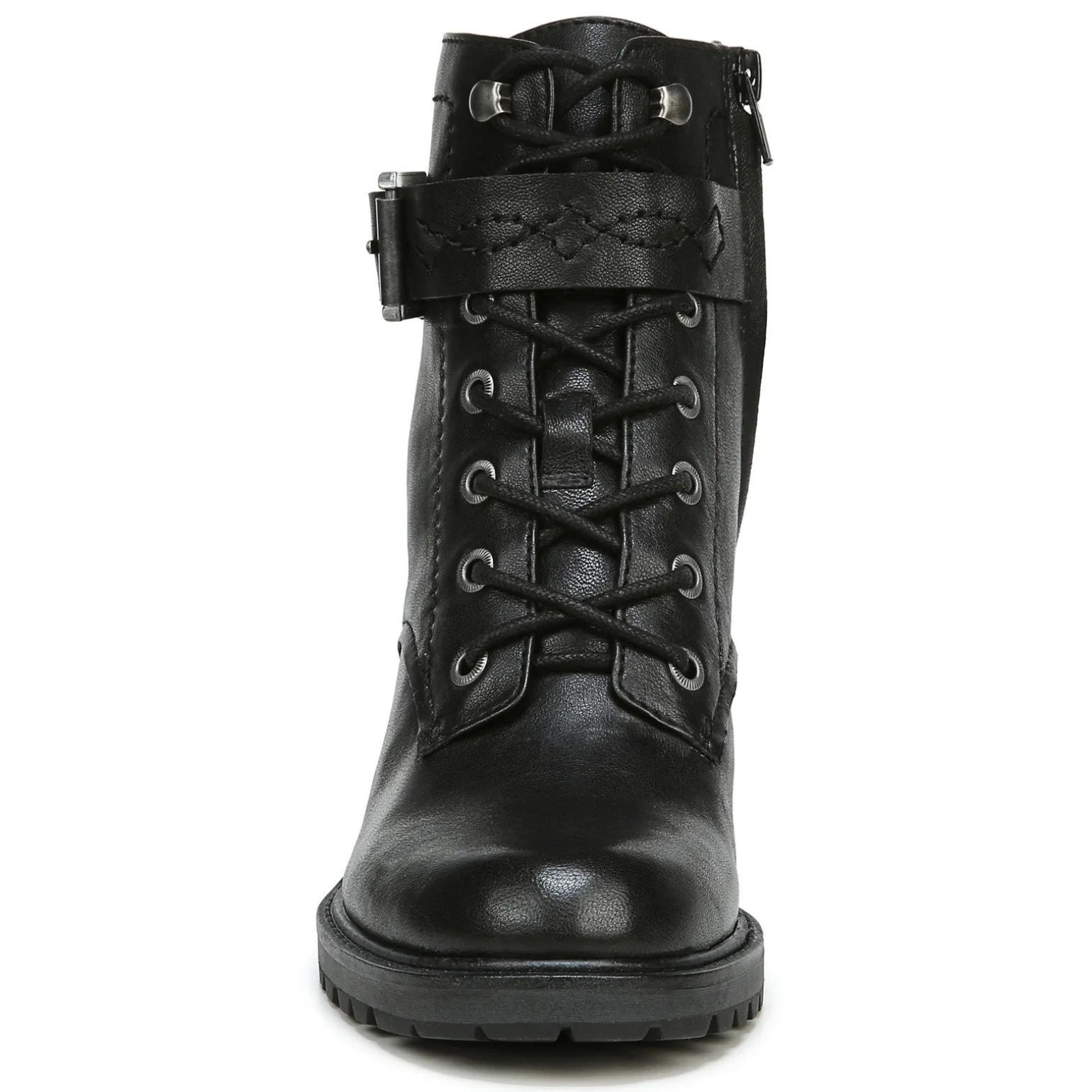 - Laced front panel with buckle accent strap and side zipper for easy on and off