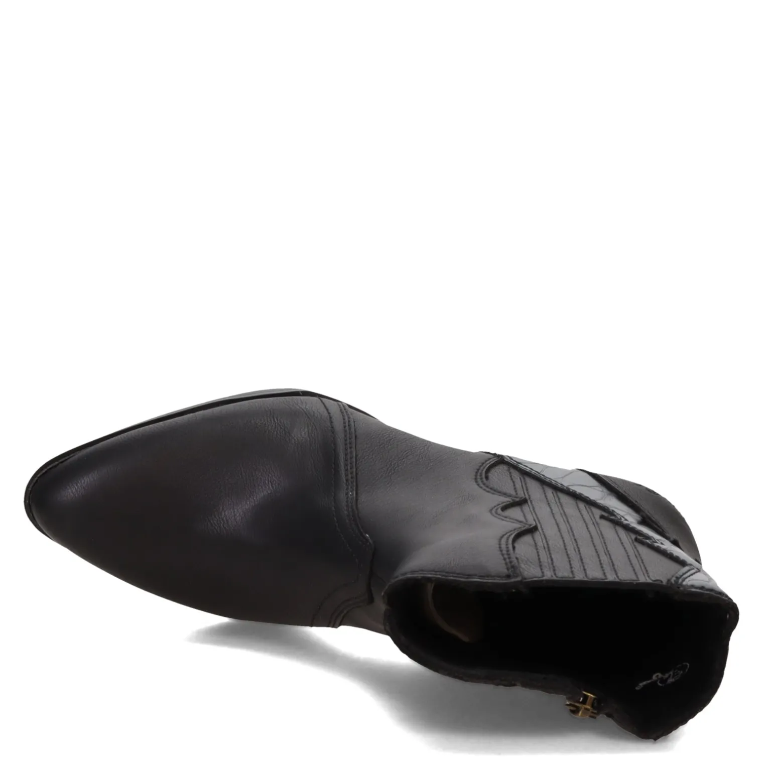 These boots are the perfect combination of comfort and style with a low block heel and western styled details. The tapered toe allows for a sleek look while the cushioned footbed allows for all day comfort Faux leather upper with overlay and stitching detail Western styled look with tapered toe Zipper closure for easy on and off Breathable textile lining Cushioned footbed for added comfort Manmade outsole with low boot heel