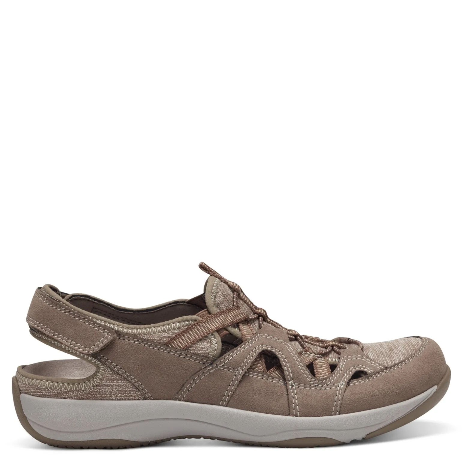 - Premium leather and fabric upper in a closed toe sandal style