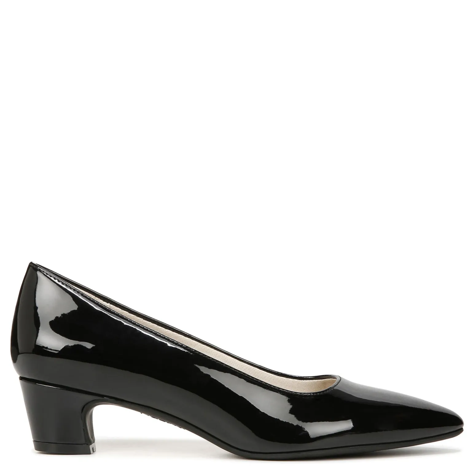 - Faux leather uppers in a low heel pump style