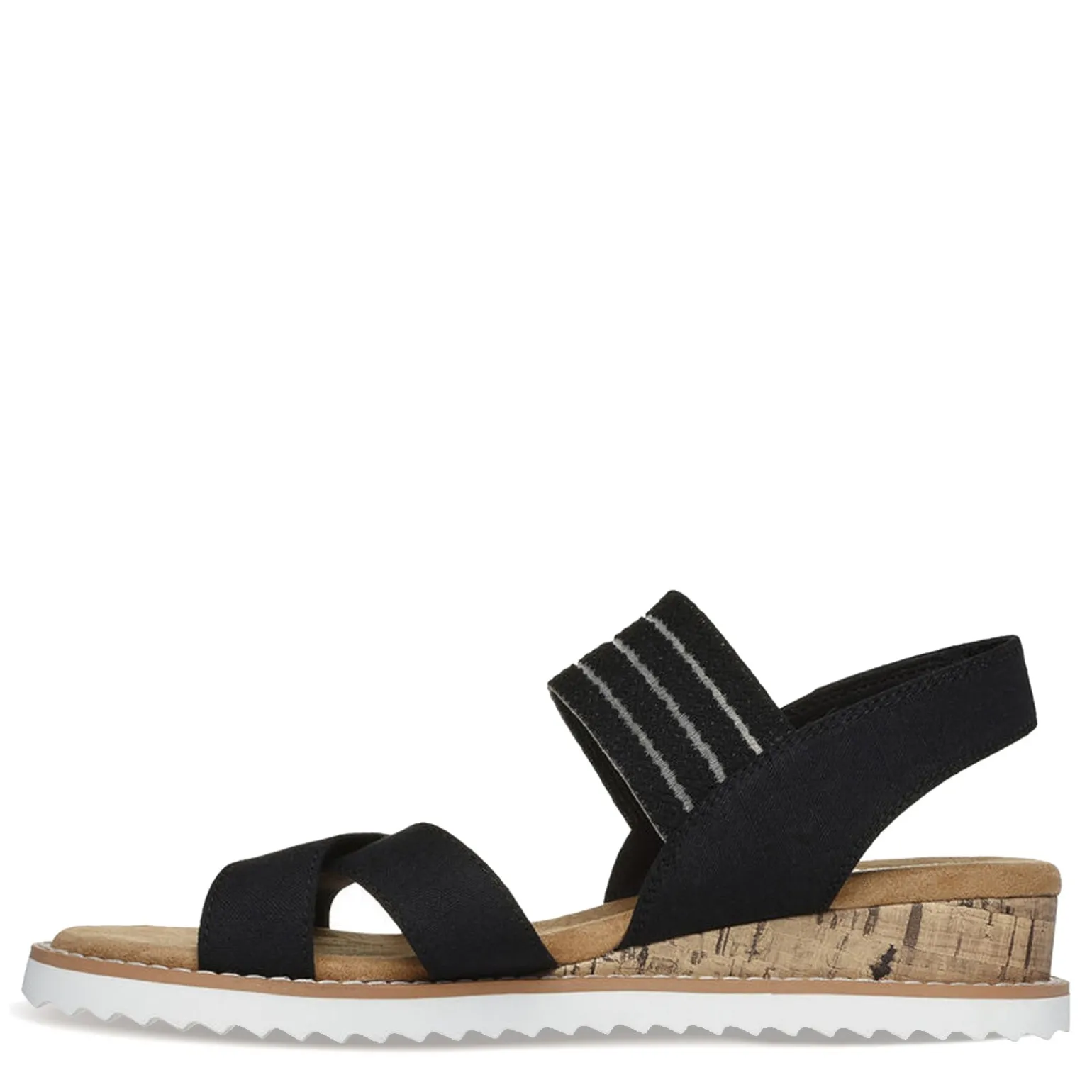 Prepare for warm weather with style and comfort in the Skechers BOBS Desert Kiss – Shore Enough sandal, a vegan fashion wedge designed for summer adventures. Featuring a canvas cross-strap upper, breathable mesh instep, adjustable sling-back strap closure, cork veneer midsole trim, and a cushioned Skechers Memory Foam footbed, this sandal offers the perfect blend of fashion and functionality for sunny days ahead.