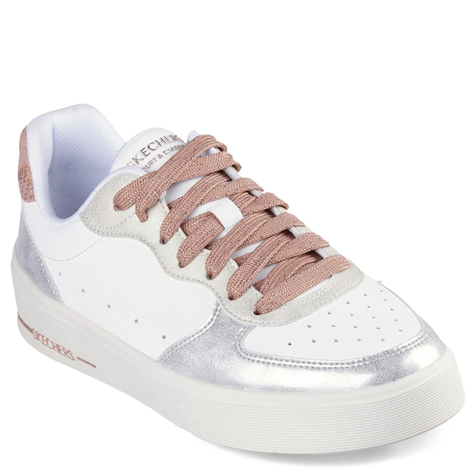 Skechers Hiland – Soft Metals blends classic charm with contemporary flair, featuring a stylish lace-up design crafted from duraleather with shimmering metallic overlays. With a cushioned Skechers Air-Cooled Memory Foam insole and a discreet hidden wedge, these sneakers offer both eye-catching elegance and all-day comfort.