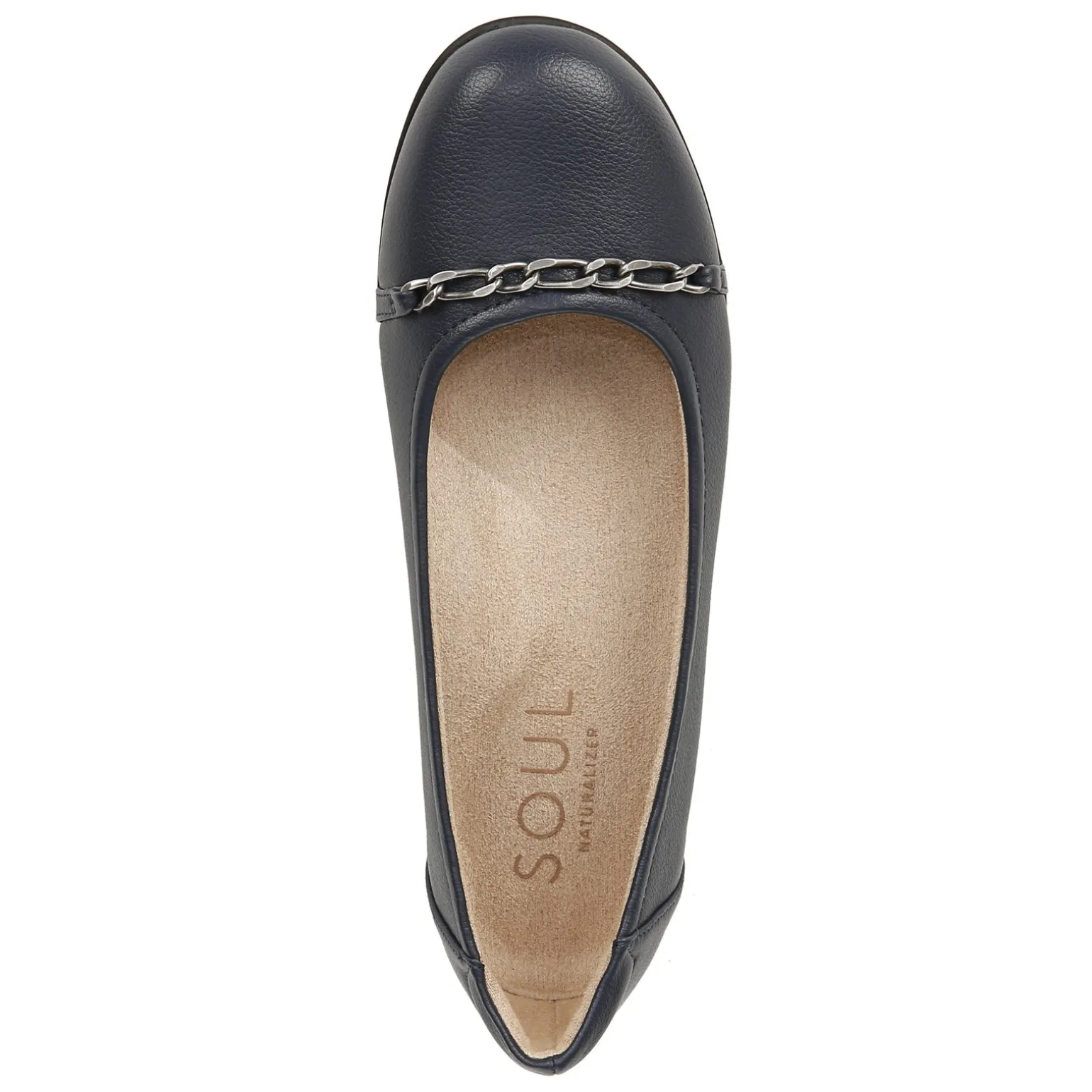 These faux leather ballet flats offer a feminine look that’s comfortable enough to wear all day. With an elegant chain trim and cushioned memory foam footbed, this versatile style features sleek modern lines and sophisticated style paired with total comfort Smooth manmade uppers featuring chain accent for added appeal Slip on style for an easy on and off Fabric linings All Thru Comfort padded memory foam footbed with arch support for added comfort Manmade outsole